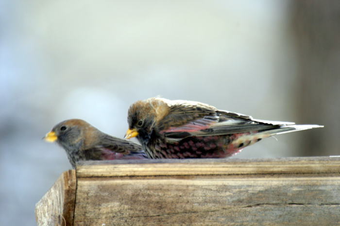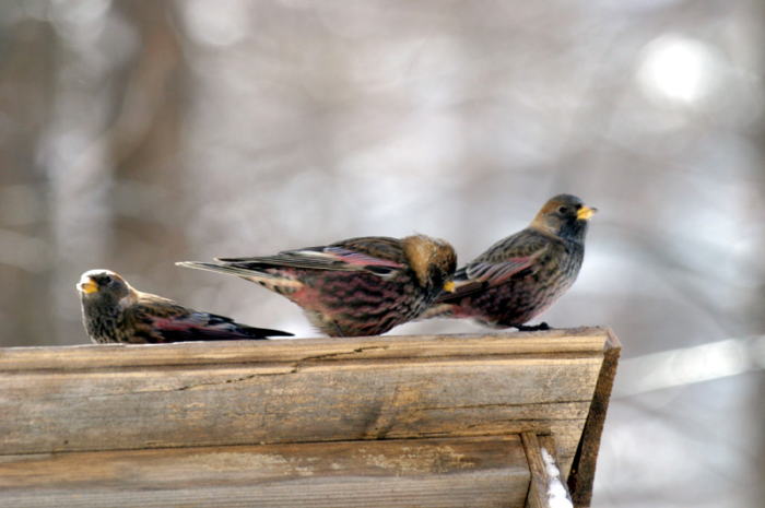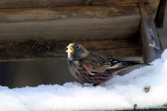 ハギマシコは翼と下面が萩色のアトリ科の冬鳥で、シベリア東部、カムチャッカから渡ってきますが、多くはないのでめったに見られません。 崖や岩場の周辺を好み、冬は数十羽の群れで生活しています。 日陰の岩場で見かけると萩色が黒ずんで見えますので、それほど美しくないのですが、日光が当たる処では写真のように鮮やかな萩色で、オオマシコ(第27回)とともに美しいマシコの仲間です。 写真は今年のお正月(04.12.31〜05.1.2)、蓼科高原の宿の日の当たるフィーダー(餌台)に20羽くらいの群れで現れたところを窓から撮ったものです。 一日中、フィーダーに次々に現れましたので、数時間眺めることが出来ましたが、距離が近すぎて群れ全体を撮ることが出来なかったのが残念です。 |